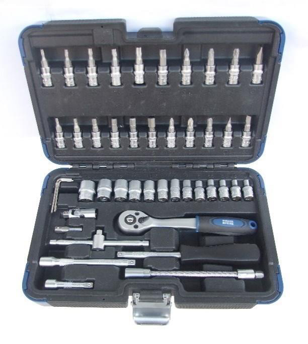 Set complet de 46 tubulare in dimensiuni metrice si Inch, cu antrenari multiple. Include tubulare scurte si lungi pentru acoperirea tuturor situatiilor. Organizator inclus pentru depozitare ordonata. Material otel Cr-V tratat termic.